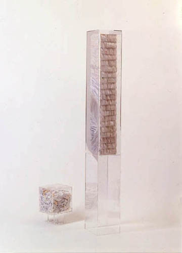 PapierSkulptur in Plexi Notationen von Friederike Mayröcker Materialreste in Plexibox 100cm x 15cm x 17cm 1986 Tonaufnahme: Zitatfragmente des Portraits gelesen von Friederike Mayröcker | ||||||||||||||||||||||||||||||||||||||||||||||||||||||||||||||||||||||||||||||||||||||||||||